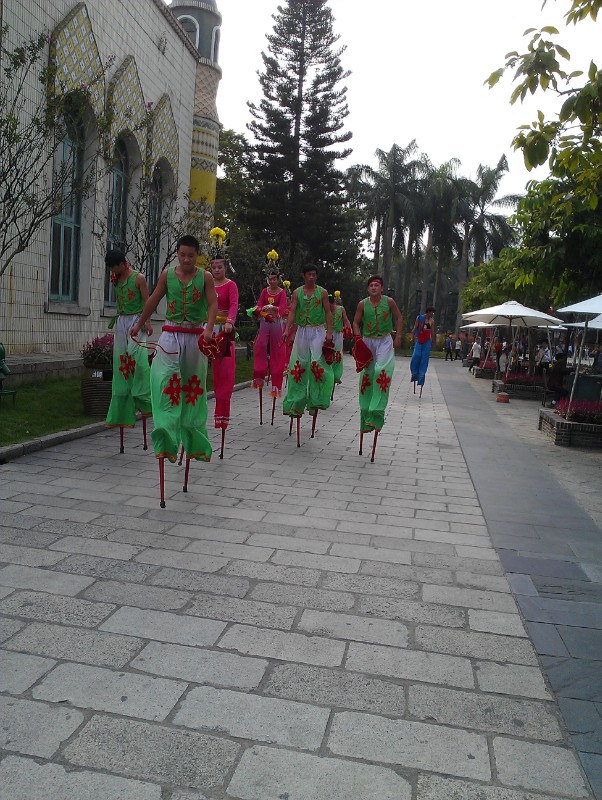第三天我們留給了具有現(xiàn)代化氣息的東部華僑城(簡(jiǎn)稱(chēng)OCT.east )。 這是一個(gè)世界級(jí)的度假村,分三大區(qū) ,充分體現(xiàn)了自然與人的和諧共處。高爾夫球場(chǎng)的綠茵萬(wàn)頃,大華興寺的香火繚繞,竹林深處的曲徑通幽,梯形茶田的清新蕩氣,五色花田的炫彩芬芳,因特拉根蘭花園的奇特浪漫,還有穿插其間各種先進(jìn)娛樂(lè)設(shè)施帶給你無(wú)限的激情挑戰(zhàn),無(wú)論是釋放壓力,尋找田園的僻靜,還是放慢生活的腳步,這無(wú)疑是一片最接近心靈的土壤。它是一個(gè)天然大氧吧,你可以盡情暢快的深呼吸,吸收山水的靈氣 。在這有一個(gè)特殊的文化氛圍,那便是華僑風(fēng)情。歌舞表演非常具有歐美范兒,熱辣搞笑。周?chē)ㄖ彩且慌晌魇窖蠓浚H有情調(diào)。一個(gè)朋友叫我到塑像前拍照,剛開(kāi)始我都沒(méi)從正面瞧,只知道是個(gè)帥哥鍋拿著把吉他,都沒(méi)有意識(shí)到是活的,擺動(dòng)作時(shí),我無(wú)意碰到他的肩膀便嚇了一個(gè)狠的,我以為是瞬間激活呢,弄得那尊“雕像”都移位了,看他快要倒了,還使勁的拉,拉了幾個(gè)來(lái)回。在場(chǎng)所有人都笑趴了,唯有這位銅人依舊從容淡定。可是當(dāng)我們走時(shí),他狡黠的來(lái)回轉(zhuǎn)動(dòng)了他那兩只圓滾滾的眼珠。如果在里面走累了,可以租腳踏車(chē),乘游覽車(chē)、觀(guān)光大巴,還可以坐索道或者體驗(yàn)深林小火車(chē)穿梭蜿蜒其中。